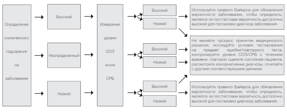 Поскольку СОЭ и СРБ не обладают достаточной чувствительностью или специфичностью, для пациента с неопределенным клиническим подозрением на заболевание, измерение СОЭ и/или СРБ не изменяет вероятность заболевания в достаточной степени, чтобы изменить медицинское решение и курс лечения. Однако для пациента с низким клиническим подозрением на заболевание низкий уровень СОЭ и/или СРБ может снизить вероятность заболевания после теста в еще большей степени, что дает врачу дополнительную уверенность в исключении заболевания. Высокое измерение СОЭ и/или СРБ у пациентов с низким клиническим подозрением на заболевание может побудить врача проверить условия проведения теста на предмет ошибок и/или контролировать значения СОЭ/СРБ с течением времени. С другой стороны, для пациента с высоким клиническим подозрением на заболевание, высокое измерение СОЭ и/или СРБ может увеличить посттестовую вероятность, что поможет установить окончательный диагноз, в то время как низкое измерение СОЭ и/или СРБ не изменит подозрение врача на заболевание настолько, чтобы изменить курс лечения. Обобщенный клинический подход к использованию тестов СОЭ и/или СРБ, основанный на этих принципах, представлен на рисунке.
