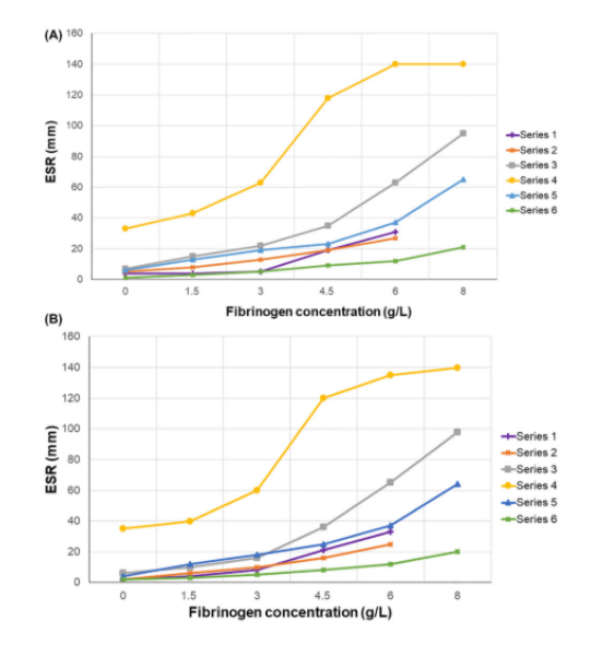 According to ICSH recommendations, the sensitivity of response to added fibrinogen was assessed in six healthy volunteers (3 females and 3 males) recruited from the laboratory staff. Human fibrinogen (Sigma-Aldrich, St Louis, MO, USA, expected concentration 20 g/L) was dissolved at 37 °C in 0.9% saline solution, and sterile-filtered using a 0.22 μm filter (Merck Millipore Ltd., County Cork, Ireland), as recommended by the manufacturer. Fibrinogen concentration obtained in stock solution was 14.8 g/L, measured using the automated Clauss method (Sysmex CS-5100, Sysmex Corporation, Kobe, Japan). Samples were prepared, with the addition of saline solution alone, or saline spiked with stock fibrinogen to reach concentrations of: 1.5, 3, 4.5, 6, and 8 g/L and added to each tube. ESR was determined first on the VES-Matic 5 analyzer and then by the original Westergren method. The baseline fibrinogen concentration (normal range 1.5–4.5 g/L) of six volunteers (shown as series in Figure 2), measured by the Clauss method, was the following: series 1: 1.9 g/L; series 2: 2.7 g/L; series 3: 2.7 g/L; series 4: 4.1 g/L; series 5: 2.4 g/L; series 6: 2.2 g/L. The sensitivity for fibrinogen in four of the volunteers was assessed to reach the concentration of 8 g/L.