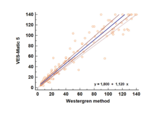 The erythrocyte sedimentation rate (ESR) was applied in clinical practice following the studies by Edmund Biernacki in the 19th century, even though the test was standardized many years later by another scientist, Alf Vilhelm Albertsson Westergren [1]. Since its discovery, ESR is the laboratory test that quantifies a complex biological phenomenon, i.e., the behavior of a suspension of red blood cells in plasma under specified conditions. ESR is not linear and plotted against time; the sedimentation shows a sigmoid curve. Three phases are known. The first is the “lag phase” in which erythrocytes form rouleaux and aggregates and the sedimentation is very slow. The second, or “decantation phase,” is the true sedimentation phase. Erythrocytes fall more rapidly because the plasma interface and the sedimentation can occur more rapidly. In the final phase, erythrocyte aggregates pile up on the bottom of the tube. New technologies and technical advances allow automated instruments to perform ESR testing, in consolidation with the modern organization of clinical laboratories. Automated instruments have great advantages like safety for operators, reduced turn-around time, and better analytic precision. Some of these instruments use the sedimentation principle by selecting an appropriate time interval, while others use other innovative techniques, which are different from the sedimentation rate. For a long time, the International Council for Standardization in Haematology (ICSH) advocated ESR standardization and harmonization. The last document, published in 2017, was an obvious need to evaluate the different automated methodologies and all the working methods against that of the reference, that is the Westergren method. The recommendations were established to document the reliability, accuracy, and robustness of the results against the Westergren method for all new instruments, both for those based on the modified sedimentation principle and those that use different techniques. Recently, a novel fully automated system, the VES-Matic 5 (DIESSE Diagnostica Senese, Monteriggioni Siena, Italy), has been proposed for ESR determination. Using closed ethylenediamine tetraacetic acid (EDTA) tubes and with a complete automation process, the instrument evaluates the sedimentation of the red cells and using a mathematical algorithm converts the raw data obtained into ESR results. The instrument also uses artificial intelligence (AI) to detect pre-analytical errors, for example, coagulated or unfilled samples. The aim of the present study was to perform the analytical validation of this new automated analyzer for ESR testing, in agreement with ICSH recommendations.