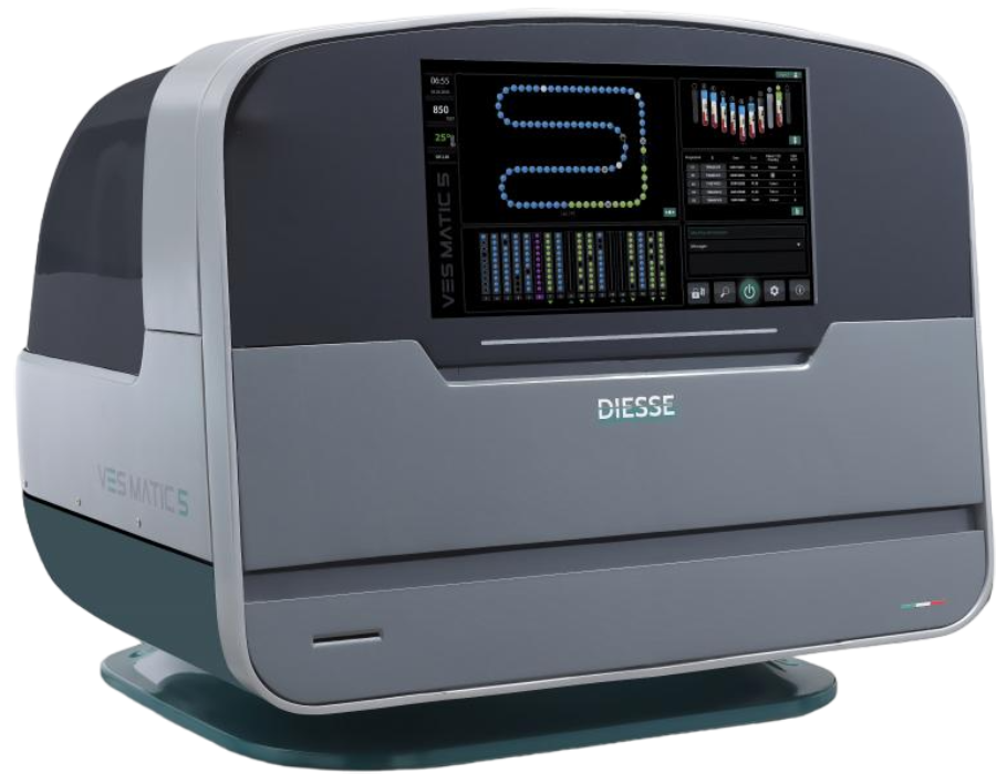 The new automatic instrument for the determination of the ESR, the VES-Matic 5 is based on a modified Westergren sedimentation technique. Briefly, all samples are collected in an EDTA anticoagulated tube, loaded into the instrument on the same rack of the CBC instruments, samples are mixed, and under controlled temperature evaluated for sedimentation measurement using an optoelectronic light source. The sedimentation rate is evaluated by a large number of optical recordings during a 20 min period and the differences are evaluated. Raw data are corrected for temperature variations and the obtained results are converted to Westergren values using a mathematical algorithm. The first result is performed after 28 min. Technologically innovative, the new analyzer applies an AI system in recognition of lipemic, hemolyzed, coagulated, or mislabeled samples, while the Internet of things, through an internal camera, is used for advanced remote assistance. In this way, the analyzer is connected directly to diagnostic devices, reporting any malfunction directly and receiving instructions for self-repair, where possible. The throughput is 190 samples per hour, and walk away mode and continuous loading are supported.