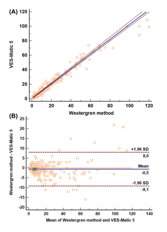 The comparison of the VES-Matic 5 against the reference method was evaluated by calculating bias and limits of agreement using Bland–Altman analysis. Linear regression was carried out using Passing–Bablok regression to estimate constant and/or proportional difference, and Spearman’s rank correlation coefficient (ρ) was calculated to assess the strength and direction of the association between the compared data. Mean and median values, standard deviations (SD), and IQRs (25th and 75th quartiles) were also reported. For the precision study, Coefficients of variation (CVs), mean values, SD, and confidence intervals (CI) at 95 % were calculated. For the evaluation of interferences, a paired sample t-test and Wilcoxon signed-rank test were used for the comparison of groups. The D’Agostino–Pearson test was used to assess data distribution normality. One-way analysis of variance (ANOVA) test was used to evaluate interference studies. Statistical analysis was performed with MedCalc Statistical Software version 19.1 (MedCalc Software bv, Ostend, Belgium; https://www. medcalc.org; 2019). Precision and verification of reference ranges were performed with Analyse-it for Microsoft Excel software, release version 5.92 (Analyse-it Software, Ltd., Leeds, LS3 1HS, United Kingdom).